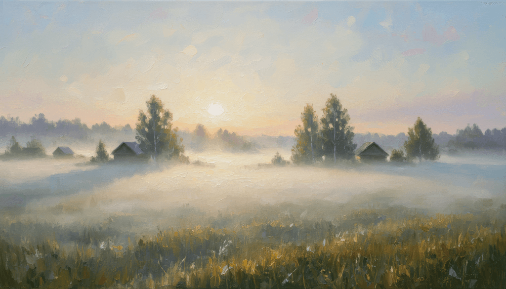 Погрузитесь в уютное утро с репродукцией «Туманное утро: Свет рассвета над деревней». Нежные переливы розово-золотого света, мягкая дымка, окутывающая поля и уютные домики, и легкие тени деревьев создают атмосферу безмятежности. Каждый мазок передает дыхание природы в момент пробуждения — от свежей зелени лугов до теплых бликов солнца на крыше. Идеальный декор для тех, кто ценит спокойствие и гармонию: эта работа станет душой вашего интерьера, наполняя пространство умиротворением и вдохновением