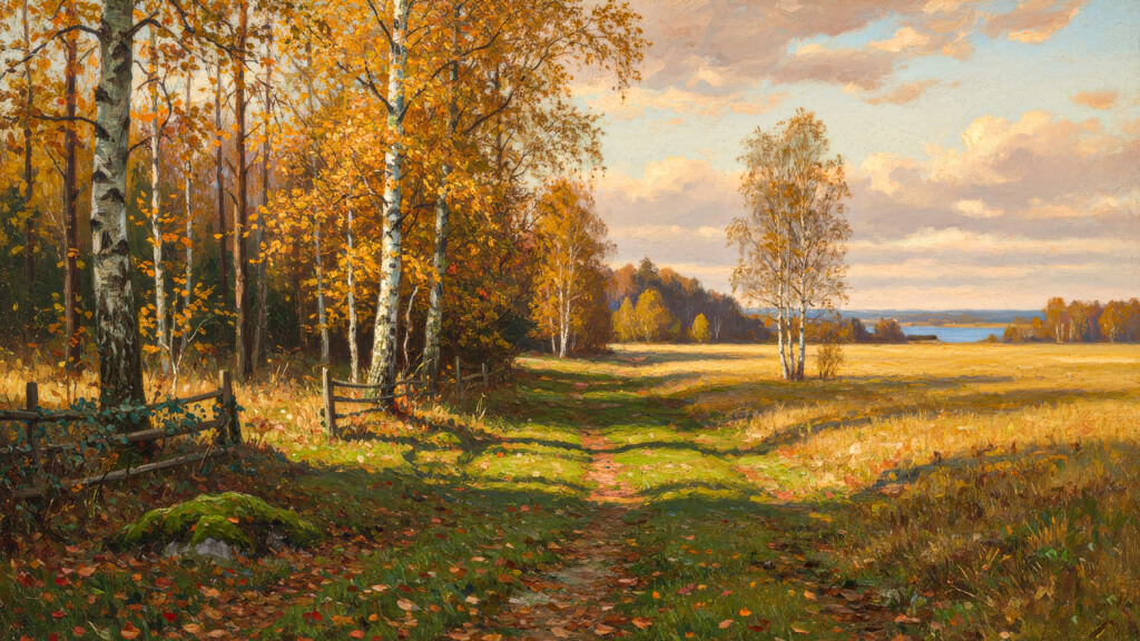 Погрузитесь в тёплую атмосферу золотой осени с репродукцией картины «Золотая осень Беларуси». Завораживающий пейзаж с берёзами в золотом уборе, уютной тропинкой и далёким озером наполняет пространство спокойствием и умиротворением.