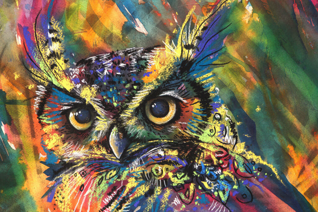 Яркая, экспрессивная картина с изображением совы, выполненная в насыщенной палитре зелёных, оранжевых, синих и золотых оттенков. Динамичные мазки и смелые цветовые сочетания создают эффект движения и энергии, словно сама ночь вспыхнула красками.